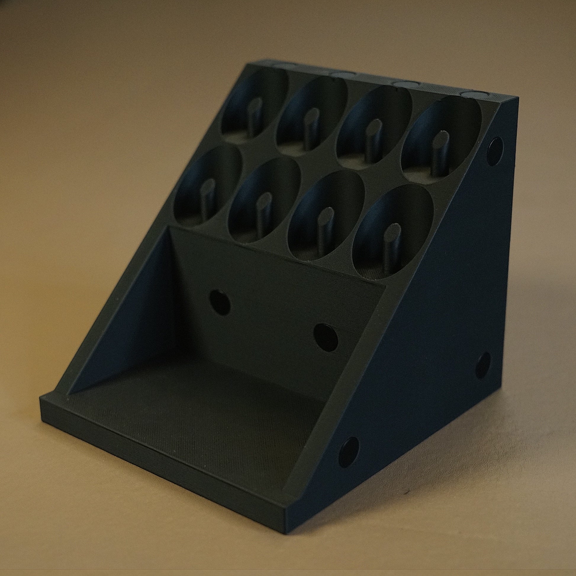 The Thread rack holds 8 spools of thread, wire tinsel, and other materials that come on standard sized fly tying material spools. this Component has magnetic attachment points that can be joined with other thread racks, Tool Sleds, different sized wedges. Base also has space for 2 standard size Inserts.